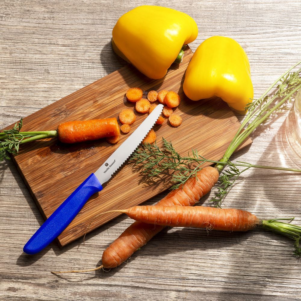 No kitchen should be without a special serrated vegetable knife designed for perfect cutting of vegetables. The knife has a comfortable plastic grip offered in three colors. The knife has a German steel blade and a comfortable plastic grip offered in three colors. Packed in a Vanilla Season gift box.