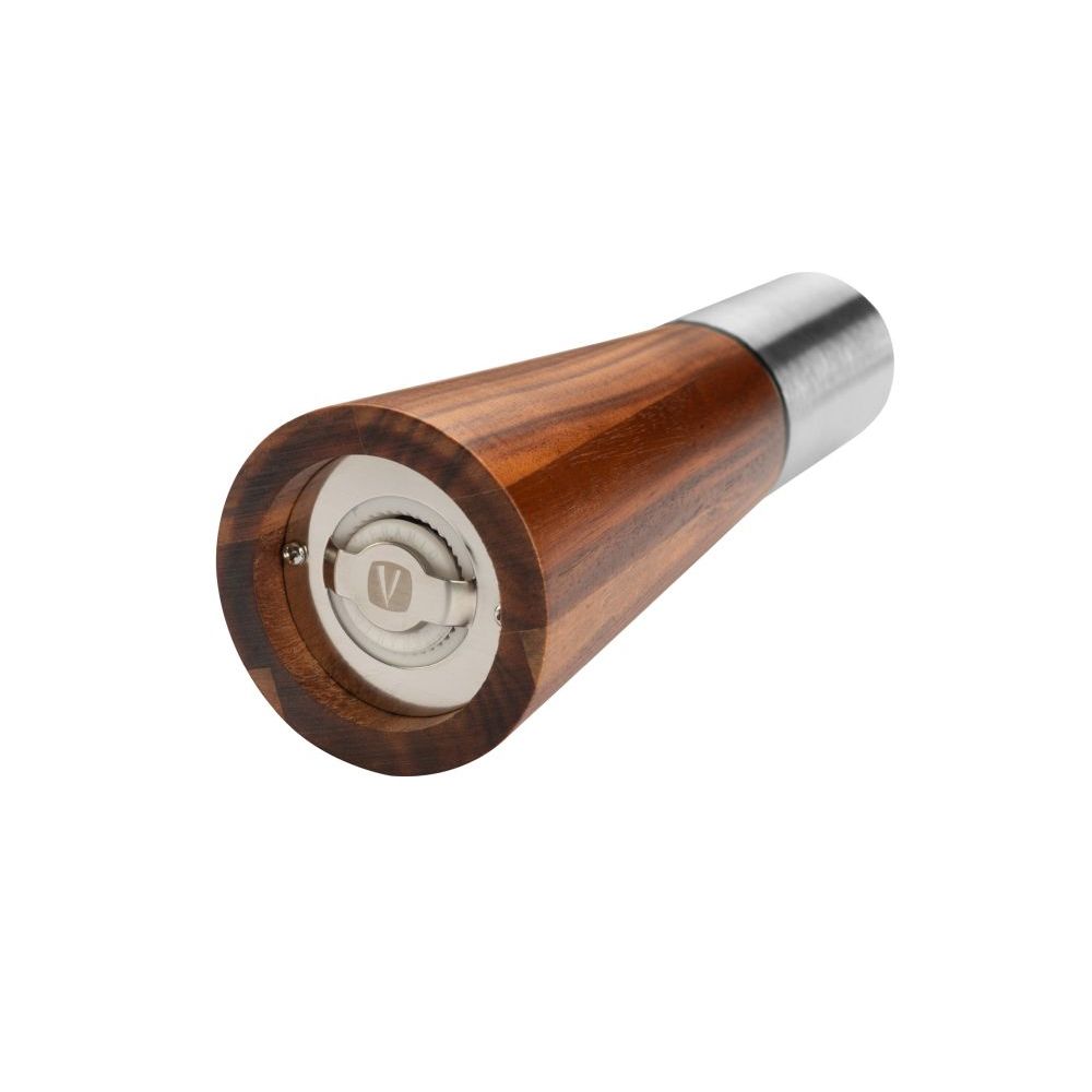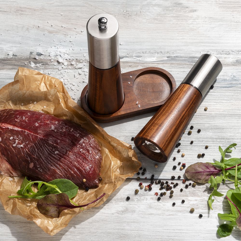 Vanilla Season elegant salt and pepper mill set with a wooden stand. The mills are designed in a combination of acacia wood and stainless steel, which creates their timeless design. The grinding stones are ceramic. Packed in a gift box.