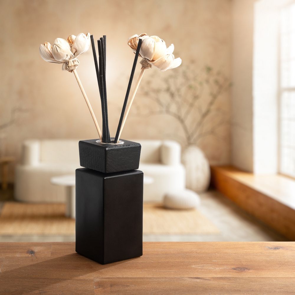 Give your home a touch and scent of elegance with the Vanilla Season diffuser. Its scent is inspired by Coco Chanel perfume and will create a feeling of luxury in your home. The black ceramic bottle has a very elegant appearance and contains 5 black reed sticks and 2 beige sticks in a flower design. The intensity of the scent depends on the number of sticks in the diffuser. The length of the sticks is approximately 20 cm and the length of the flower sticks is approximately 22.5 cm. Packaged in a gift box. Dimensions: 4.8 × 11.3 × 4.8 cm, package 6.2 × 26 × 5.7 cm.